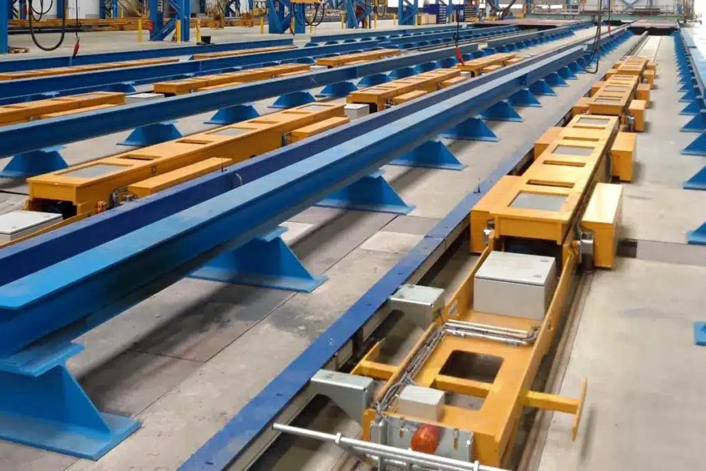 輸送トレインは通常、フラットブロックラインの最終工程で使用され、顧客のブロックサイズや重量のニーズに合わせて、製品輸送用にさまざまな種類の列車をトレインすることが可能です。